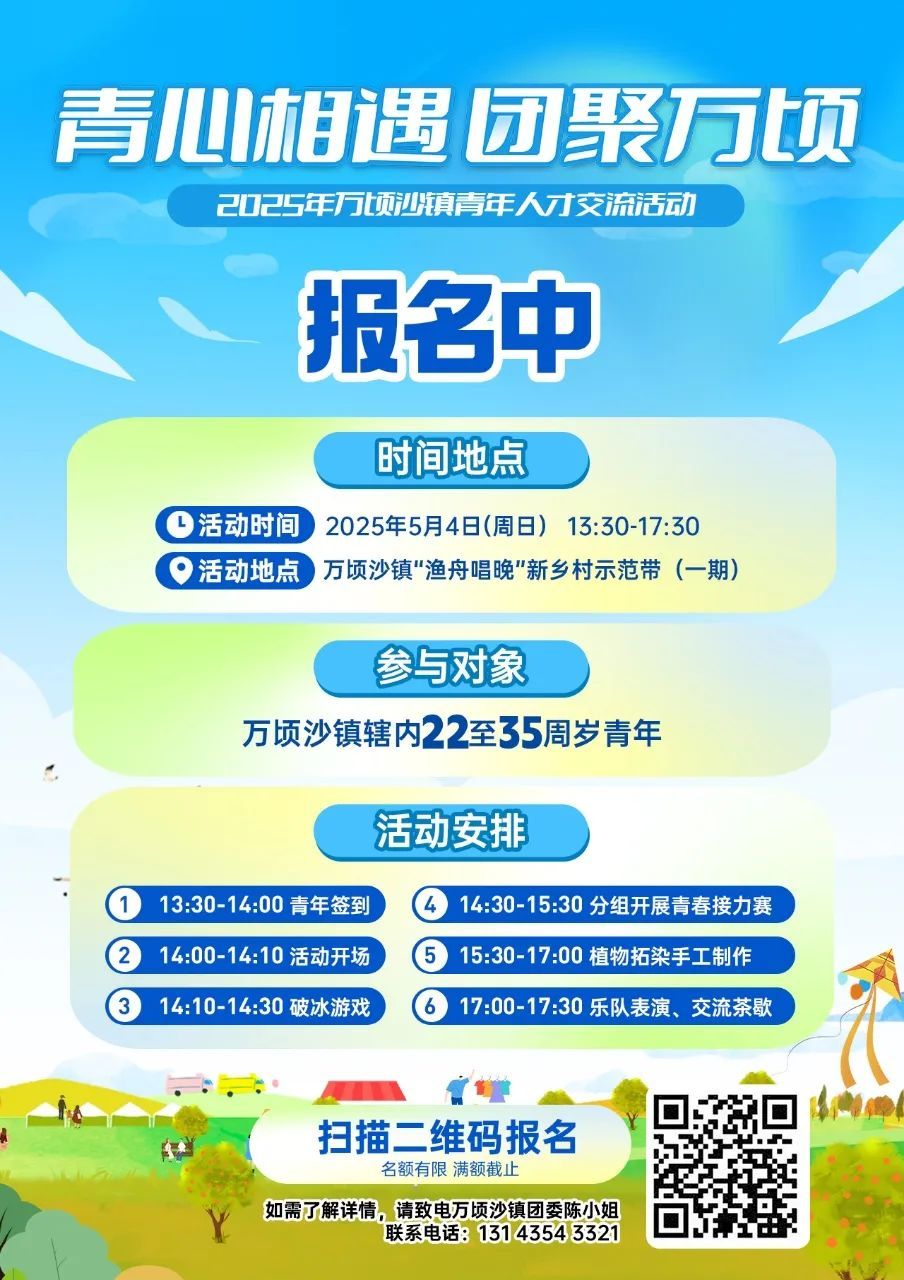 5月4日,万顷沙镇将举办“青心相遇,团聚万顷”——2025年万顷沙镇青年人才交流活动。活动将设置分组开展青春接力赛、植物拓染手工制作、乐队表演等多个环节。