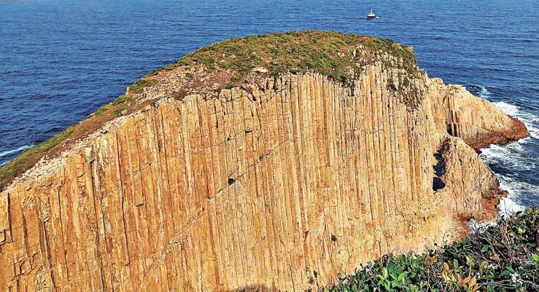 由小巴站旁的楼梯直上,可前往今年新开放的破边洲观景台。正对观景台的就是破边洲的六角形岩柱,岩柱有序排列,从海上看去像是一座巨大的管风琴。向东望去,东坝蓄起的一汪海水如碧玉一般,在阳光下熠熠生辉。