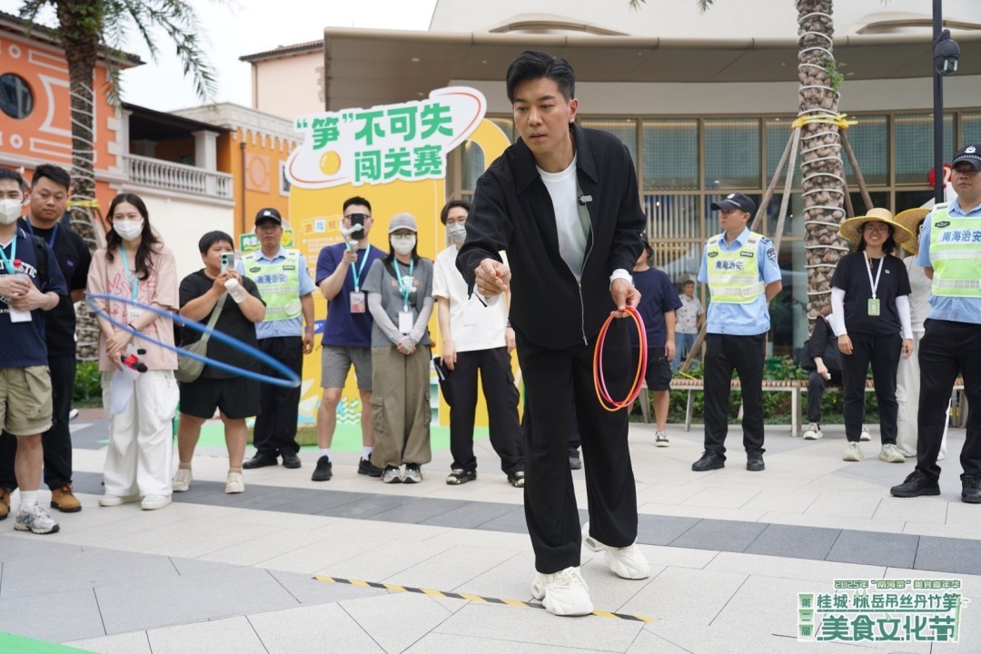 活动现场设有“笋式互动”,黎诺懿也参与到“笋式套圈”的趣味游戏中,获得围观市民和粉丝的阵阵喝彩。美食文化节的现场氛围热烈,黎诺懿表示:“很开心,很适合一家大小一起来,小朋友可以在互动摊位玩,大人可以试吃林岳吊丝丹竹笋,一次尝遍大厨们精心烹饪的菜式,这是一个可以让大家认识林岳吊丝丹竹笋的好机会。”