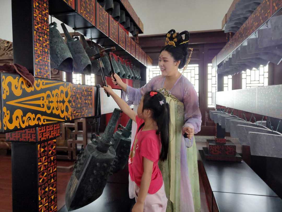 游客领取金色、银色、紫色三种任务卡。不同颜色的任务卡对应着不同的打卡任务,趣味性与知识性兼具。金卡任务中,游客需寻找“拔地倚天”石匾拍照,在沙盘上找到文奎楼、风采楼、风度楼的位置,打卡北宋最大的岑水铜场,完成宋钱和北宋交子的拓印任务,并用拓印的宋钱换取“品阅韶关”的韶阳楼五一限定款奶茶杯小挂件;银卡任务围绕唐代许浑的《韶阳楼夜宴》、张九龄的诗句、惠能菩提偈等韶关文化元素展开;紫卡任务则聚焦于韶乐演奏的乐器、广东省第一台电风扇、编钟演奏体验等特色内容,让游客在游玩中深度了解韶关的历史文化。