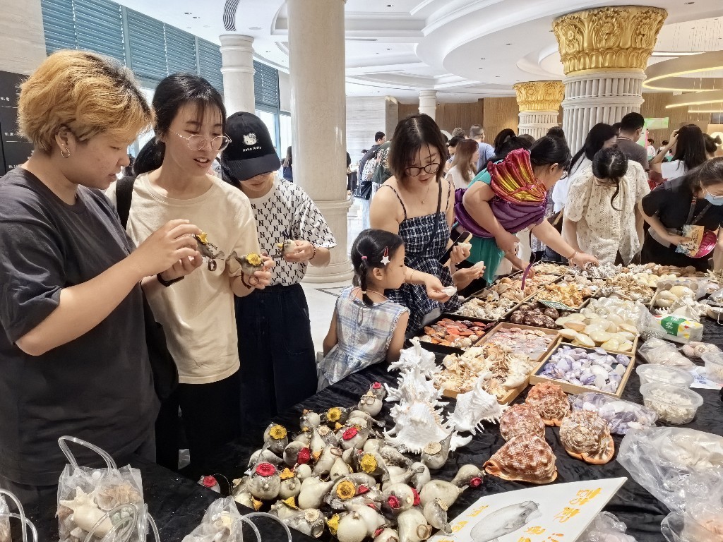 活动主办方小懒腰生活方式服务负责人介绍,位于元知商学院二、三楼的贝壳大市集,总长数百米的展位创下国内贝展新纪录。来自中国、阿根廷、巴西、莫桑比克、印度、葡萄牙、菲律宾、意大利、俄罗斯9国展商的展位鳞次栉比,既有众多贝壳收藏家来展会,也吸引了很多市民一家大小前来。除了贝类,还有昆虫标本等展出,以及众多互动体验。