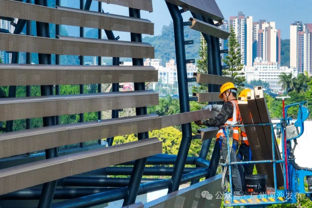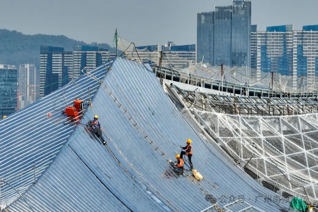 与罗卫交所在项目隔江相望的大湾区科学论坛永久项目正如火如荼建设中,建设工人正攀爬在该项目屋顶曲面,进行外立面施工。同样“悬挂”半空作业的,还有南沙期货产业园建筑工人,他们正认真地把南沙期货产业园的“四梁八柱”搭建好。