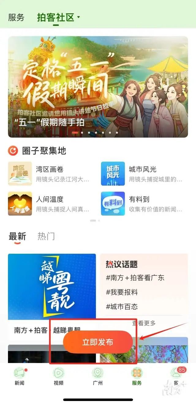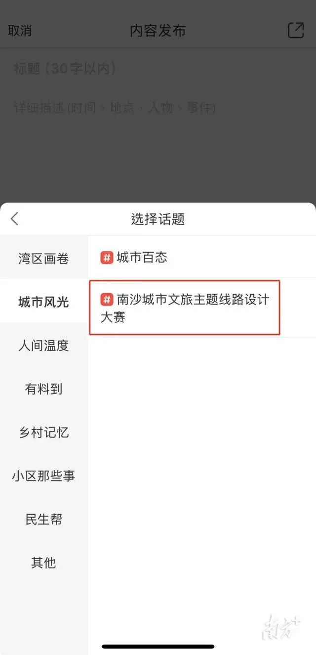 入驻南方+拍客社区,在圈子“城市风光”—话题“南沙城市文旅主题线路设计大赛”中发布作品(可参考下方示例图)。