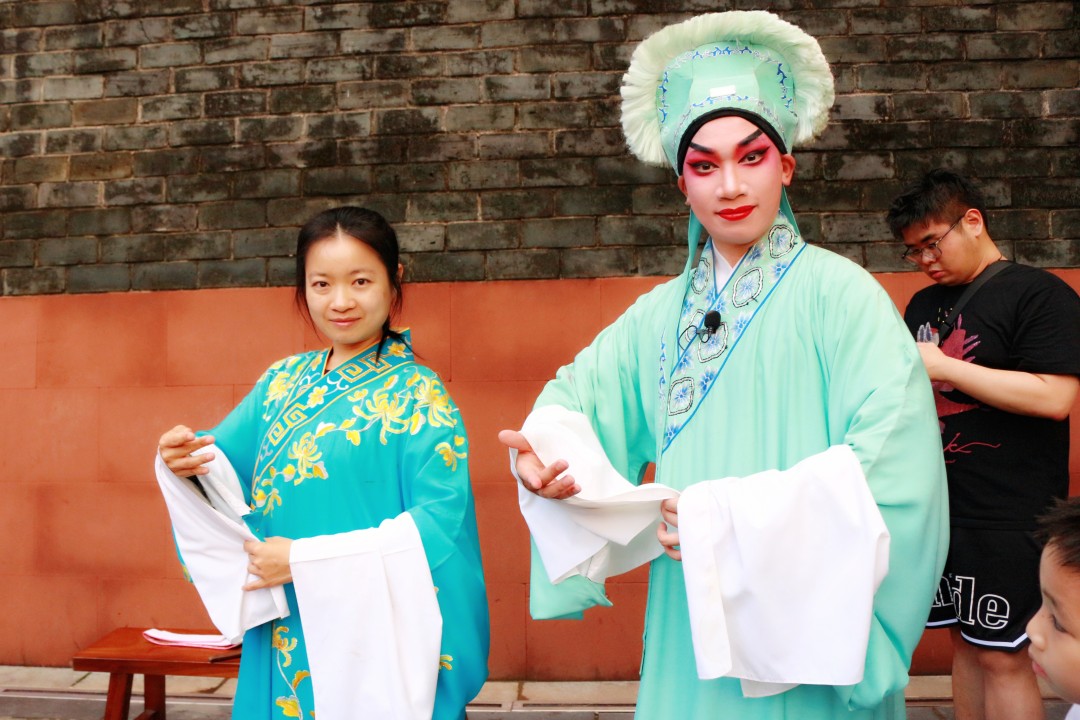 活动另一大亮点是贯穿全程的互动体验。在演出中设置“我演你猜”和“我演你学”的趣味环节。演员通过戏曲程式动作演绎“躲雨”“登船”等场景,让观众在竞猜中品味戏曲身段的独特韵味;而“我演你学”环节则邀请观众试穿戏服,学习花旦、小生的基础身段,增强观众参与度和兴奋度。