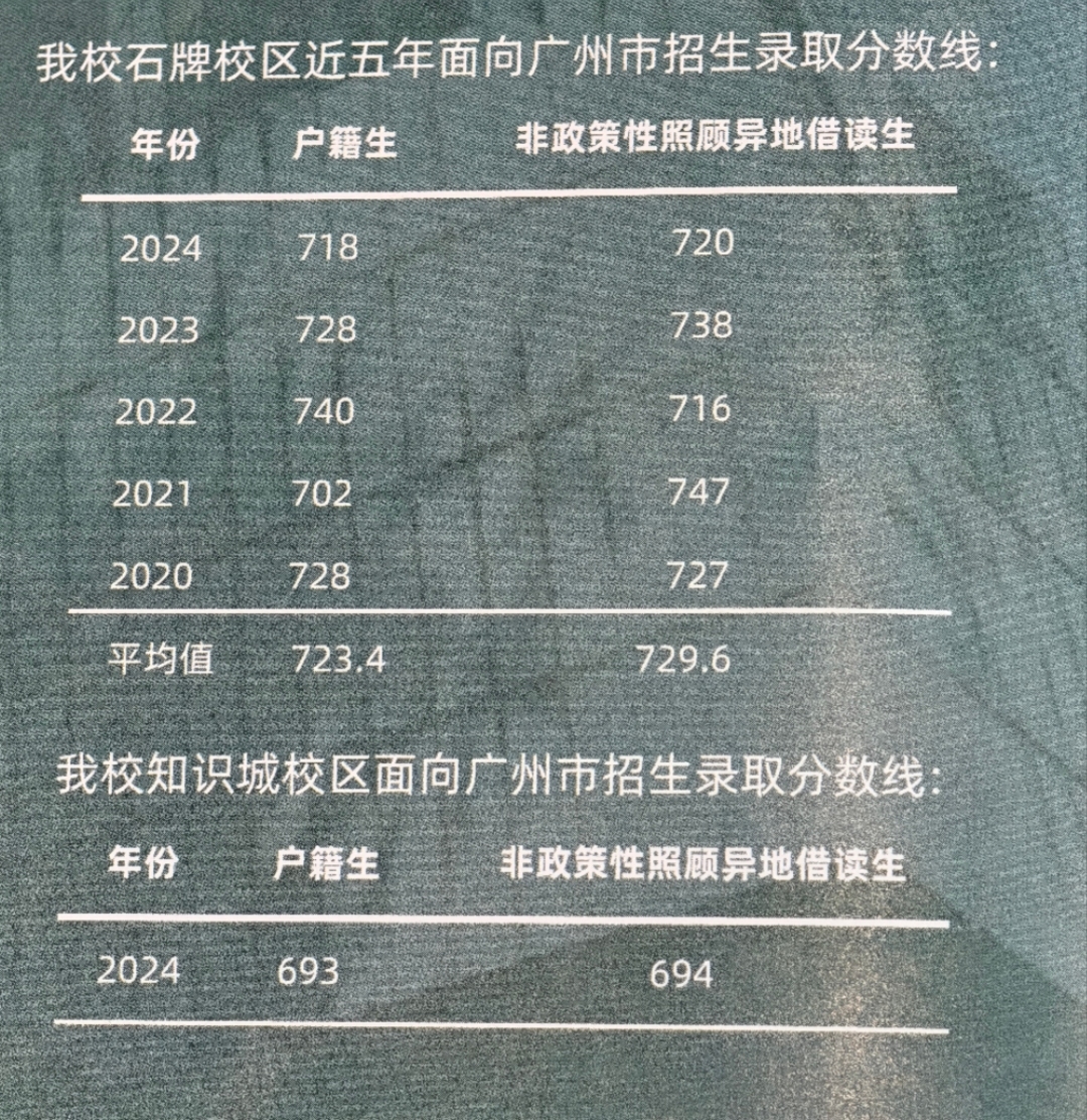 去年,华附知识城校区首次招收高中生,在中考录取第三批次面向户籍生的最低录取分数为693分。石牌校区去年在第三批次面向户籍生的最低录取分数则为719分,2023年为728分,2022年则为740分;去年对非户籍生的最低录取分数为720分,2023年为738分,2022年为716分。