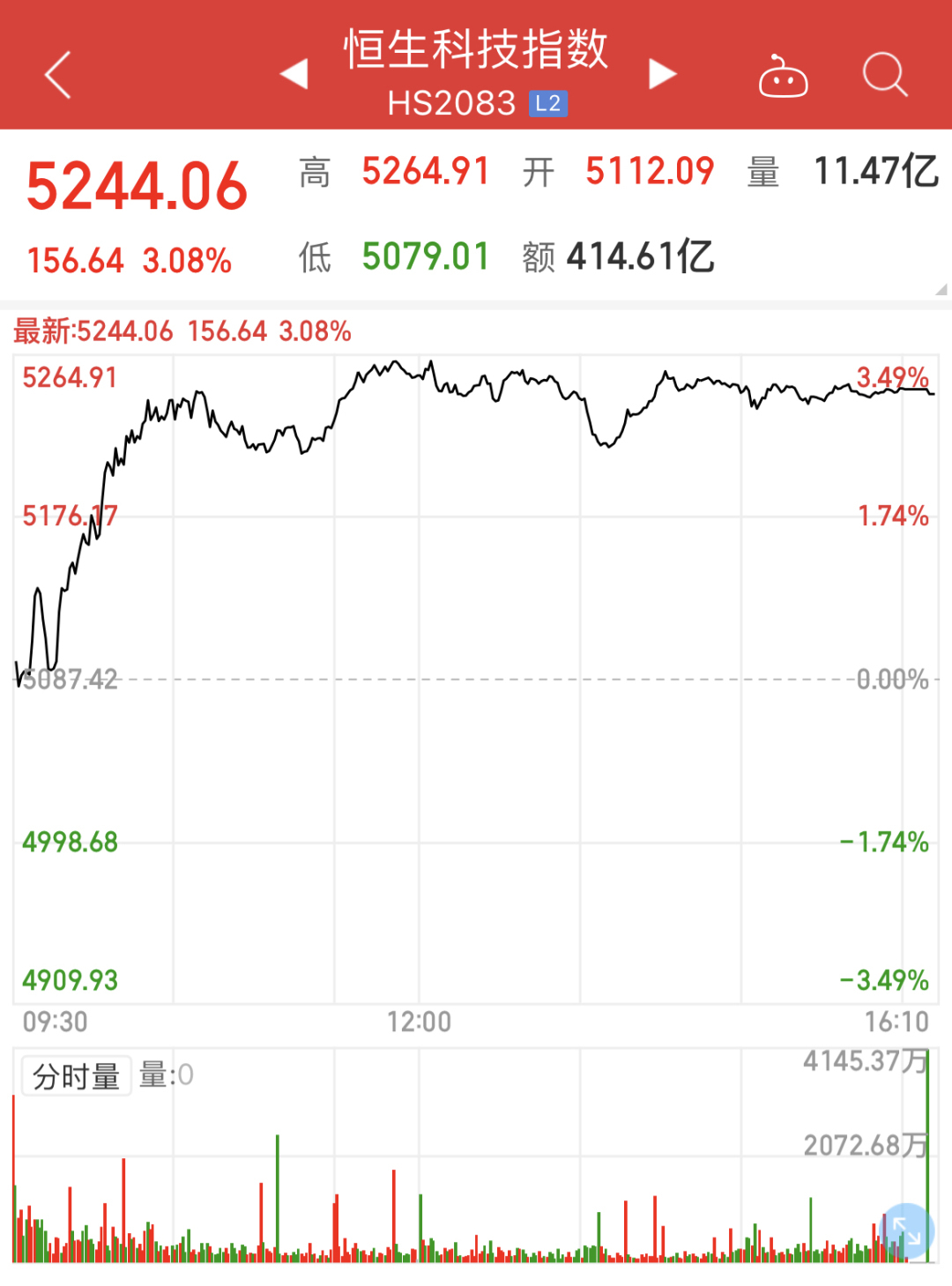 盘面上,科网股全线上涨,小米集团涨超6%,阿里巴巴、京东集团涨超3%,快手、联想集团、哔哩哔哩、腾讯控股涨超2%;新能源车企股集体走高,零跑汽车涨超7%;CXO概念股整体大涨,药明康德涨超7%;新茶饮股集体上行,奈雪的茶涨超8%。