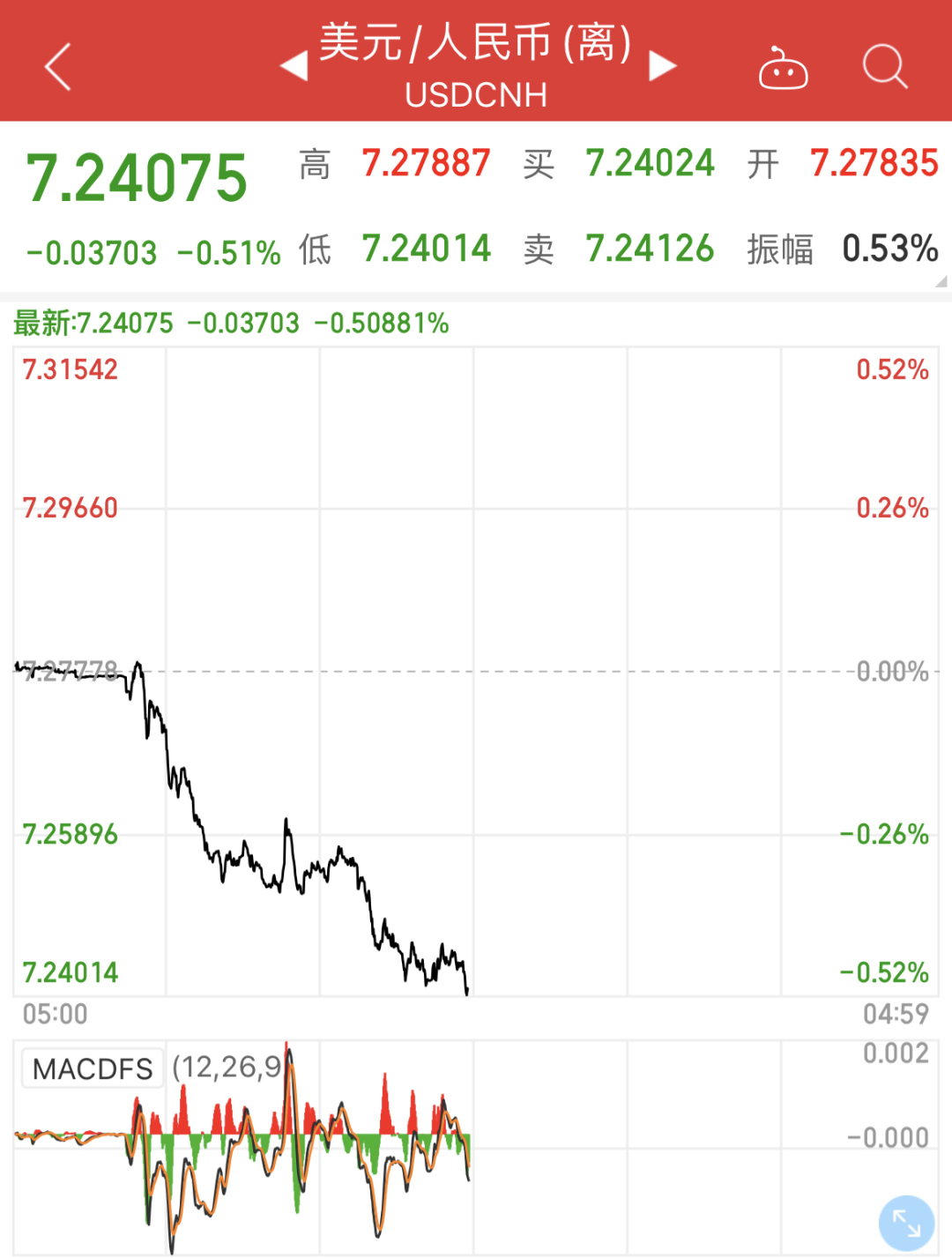 与此同时,更多反应国际投资者预期的离岸人民币对美元汇率,盘中直线拉升,日内涨超370点,一度升至7.24,为自4月4日以来的最高水平,截至记者发稿,离岸人民币对美元汇率在7.24附近波动。