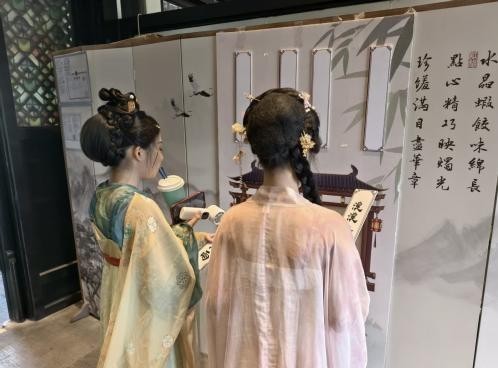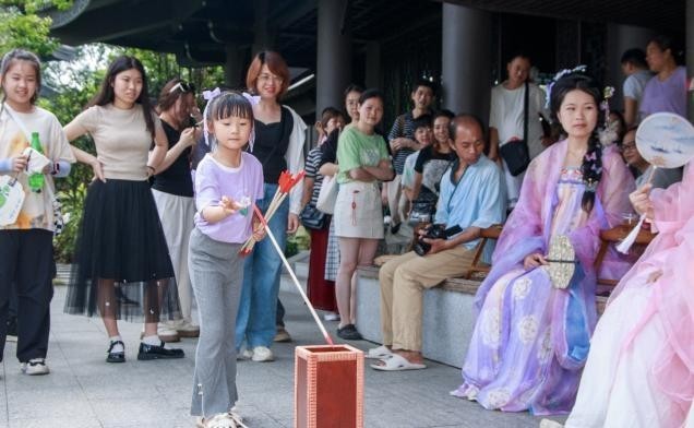 广绣园内,飞花令擂台活动吸引市民眼球,市民身着汉服化身唐宋文人,在雕花窗棂下对诗接句。参与者吟诵含“夏”字的诗句即可解锁限量文创礼盒,重现“以诗会友”的雅趣;四囍阁间,茶席与汉服风韵相映成趣,游客可免费体验宋代点茶技艺,聆听投壶游戏的欢声笑语,在茶香氤氲中感受“茶礼传世”的非遗魅力。