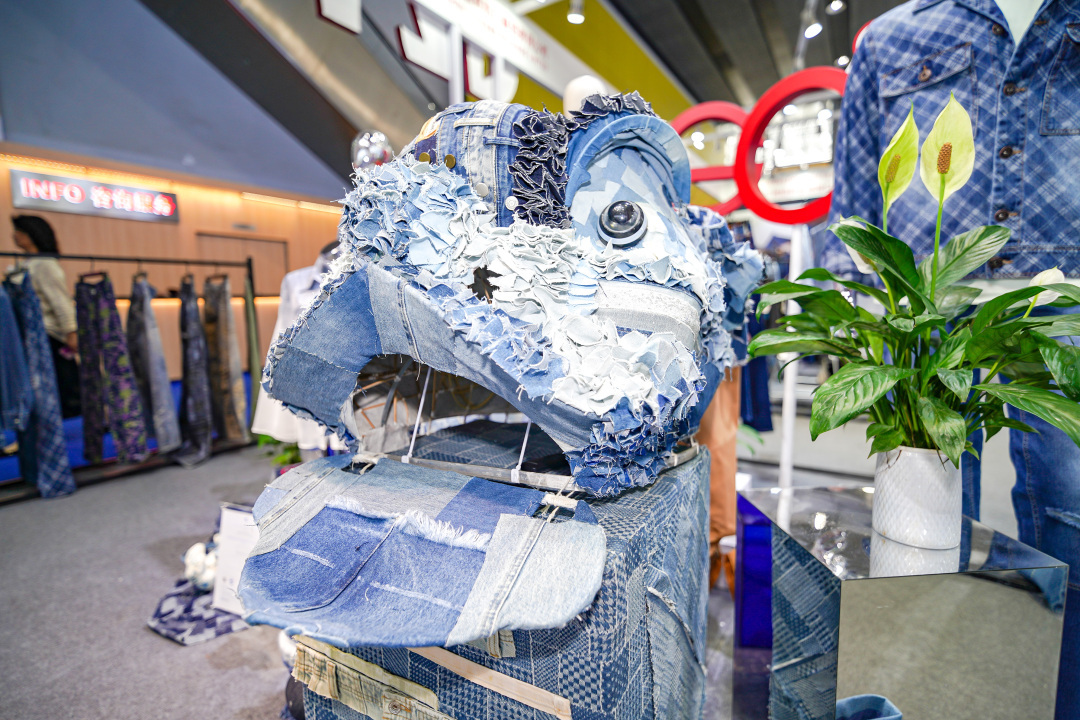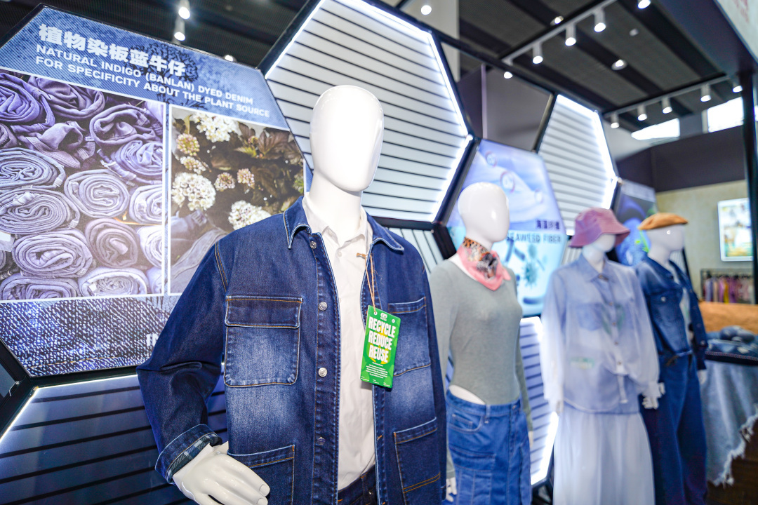 记者从广东省纺的设计中心展区了解到,板蓝根是一种具有悠久历史的天然植物染料,其叶片富含靛蓝色素,可用于生产蓝靛泥染料。“这种染料不仅色泽浓艳、牢度好,还具有环保、无毒无害的特点。”广东省纺主设计师张铭成向记者透露,公司通过创新技术,将板蓝根染料应用于多种纺织品,打造了独特的板蓝系列服装,包括牛仔、女装、休闲服等。“我们希望传统植物染料,能在更符合当下年轻人审美的现代时尚中释放新的魅力。”张铭成以陈列区一款“牛仔非卖品”举例介绍道,目前数码印染织物的技术已经可以实现比较繁复的图样展示,比如传统手工艺比如钉珠、绣花等,短时间内制作成品基本无难度,视觉效果也很好。