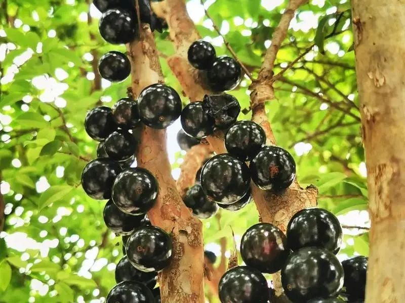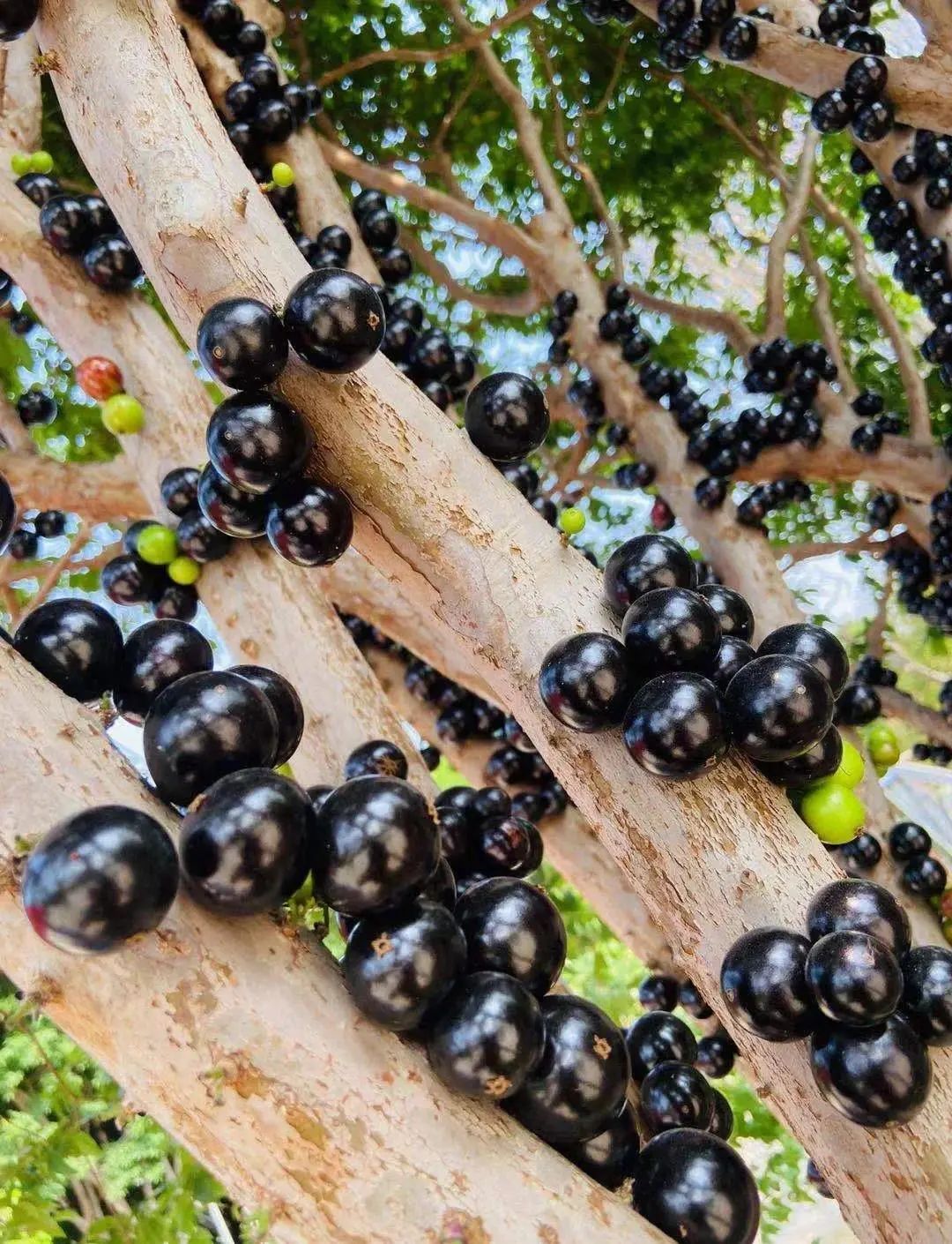 勤家园生态农场内有200多株嘉宝果树,一颗颗黑紫发亮、圆滚滚的嘉宝果缀满树干。