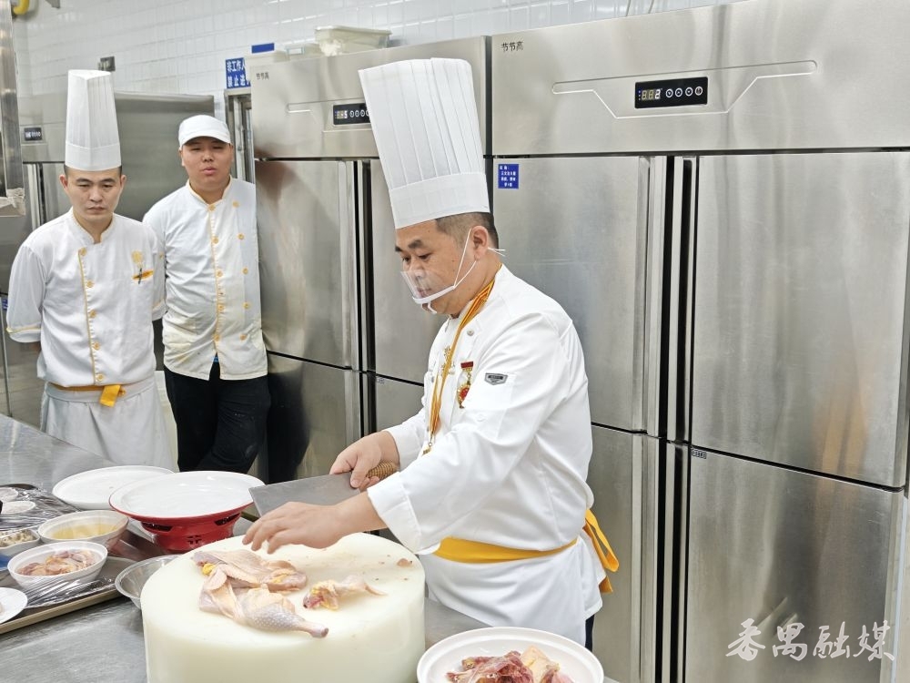 梁醒红向雍苑厨师班的师傅们演示如何处理食材
