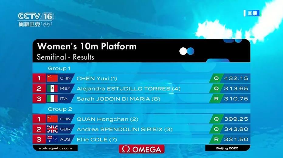 半决赛中,陈芋汐累计得到432.15分,全红婵累计得到399.25分,顺利晋级决赛。