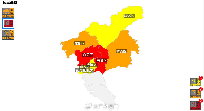 目前广州多区冰雹、雷雨大风、暴雨预警生效中,局地有龙卷风险。