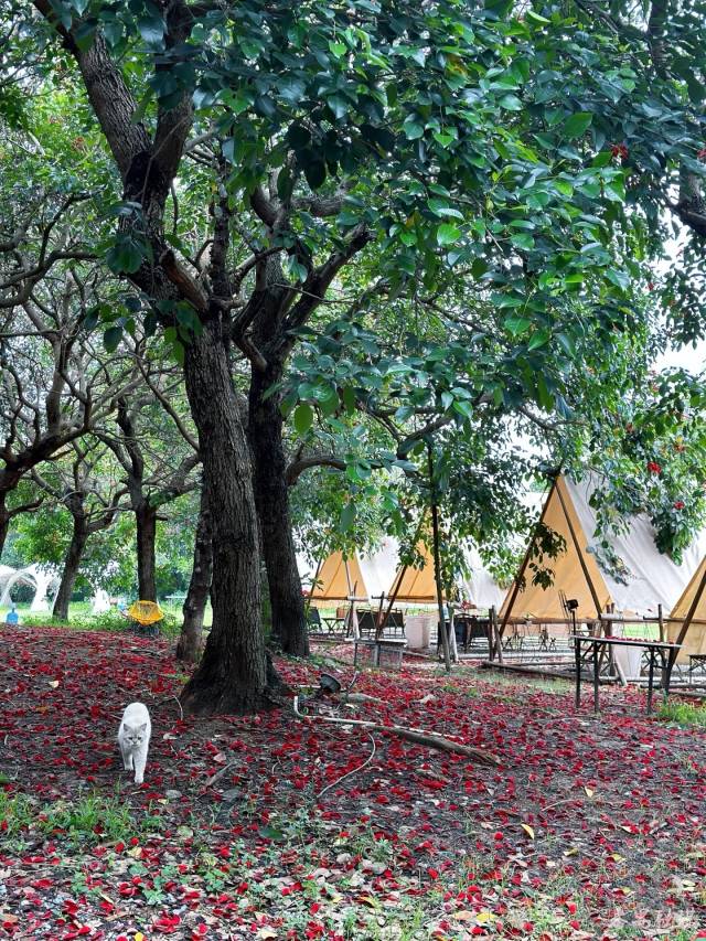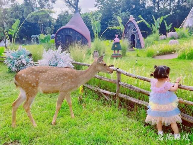 踏入这里,仿佛闯进“爱丽丝梦游仙境”,彩色小矮人木屋、摩洛哥风水池、粉色南瓜车、橙色沙池,随便一拍都是ins大片。萌宠区的梅花鹿和山羊超温顺,胡萝卜一递就凑过来贴贴,小朋友喂得超开心,还可以在草坪上滑草、放风筝。夜幕降临时,围炉煮茶、露天电影和星空KTV更是氛围感拉满。营地提供全套露营装备租赁,懒人家庭也能轻松享受野趣