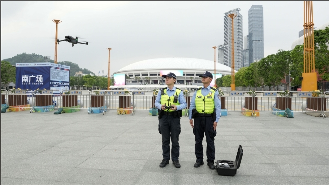 “新深圳体育馆自建成后举办过多次赛事及演唱会,尤其夜间地面警力肉眼视野受限时,无人机以高空视角迅速扫描整个活动现场,哪里人群密集,哪里有突发状况,都在无人机传回的实时画面中一目了然。”廖坚皓说道,“通过无人机喊话功能及时向群众发出提醒,配合地面安保警力有序引导安检或疏散聚集人群,为活动的顺利进行和群众的安全保驾护航。”