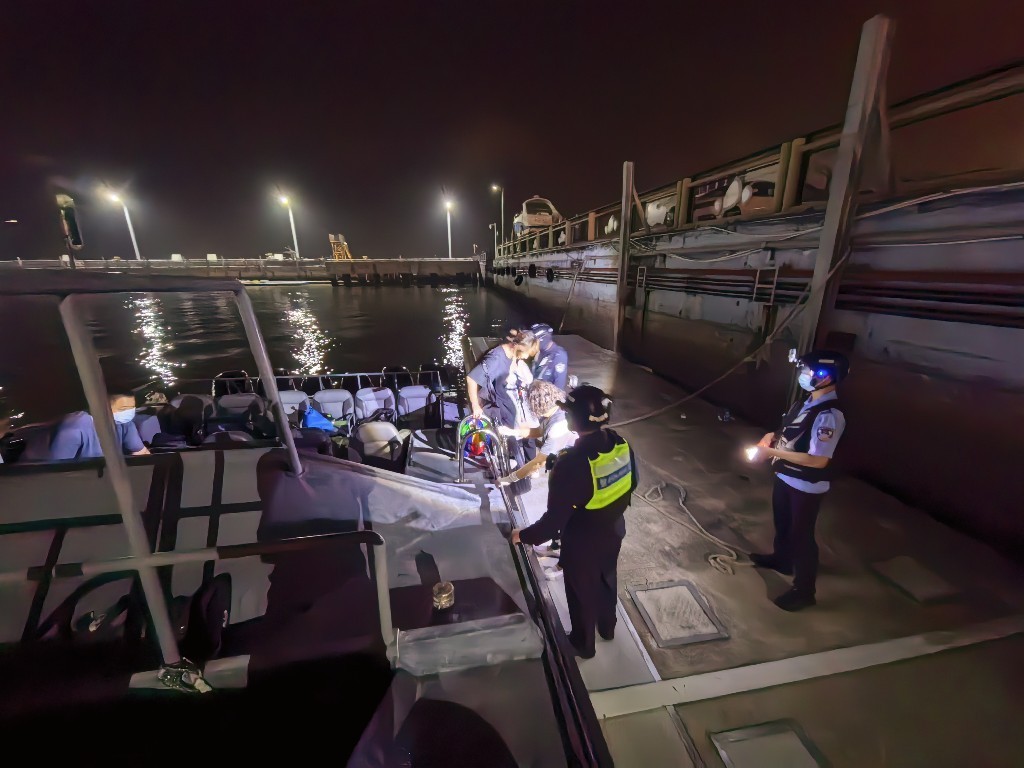 事发紧急,正在海上执行双反任务的江海文所长接到所里值守领导副所长黄常青的报告后立即返航,带领辅警陈凯旋、杨紫健及驾驶员冼文彪驾驶工作艇,迅速赶回东澳岛。在游艇码头接上急重病人、家属、医护人员和镇政府工作人员后立即启航赶回珠海市。时间就是生命,经过20多分钟的高速航行,大约晚上12点,快艇安全停靠九州港游艇码头,由救护车紧急转送人民医院急救。