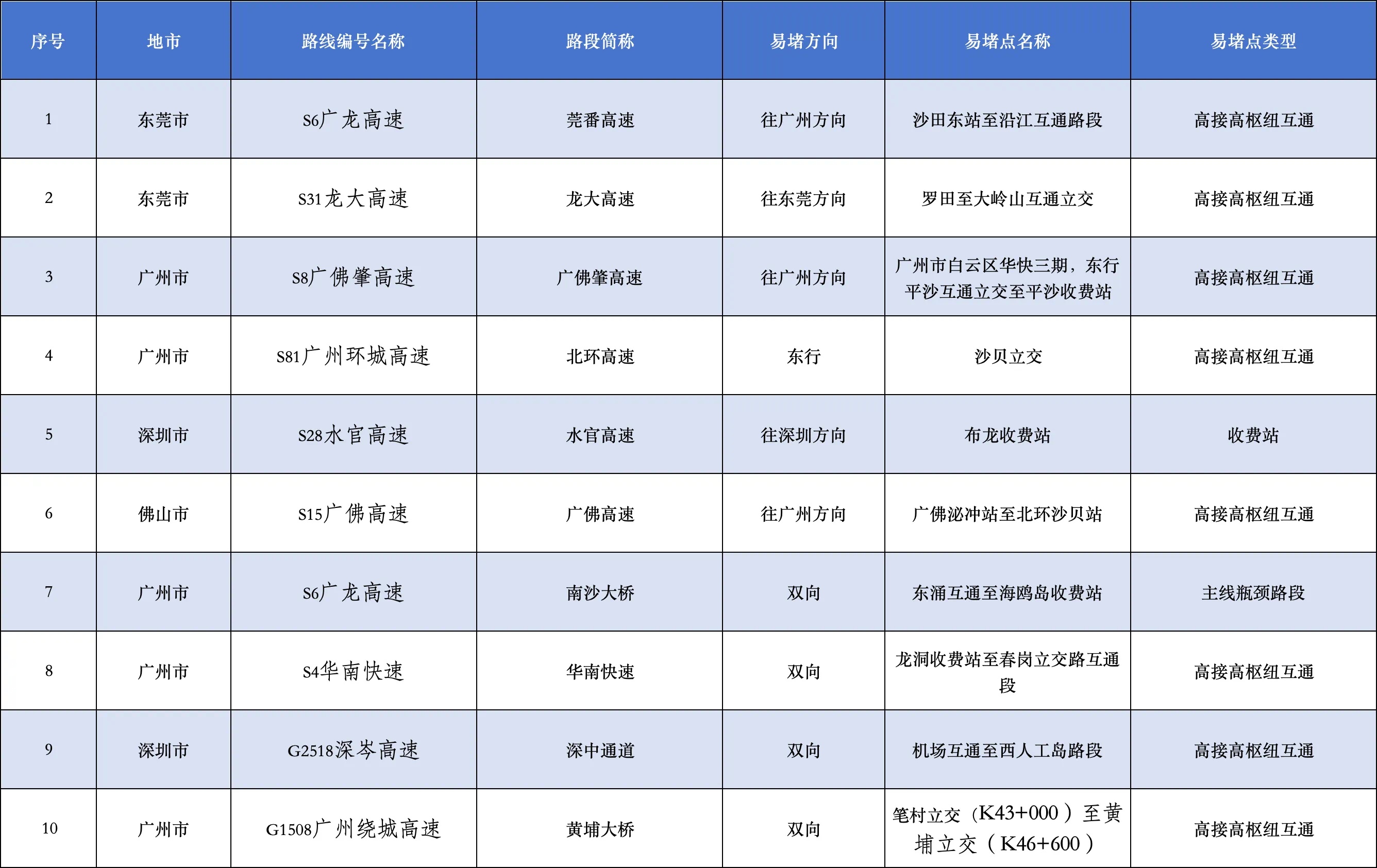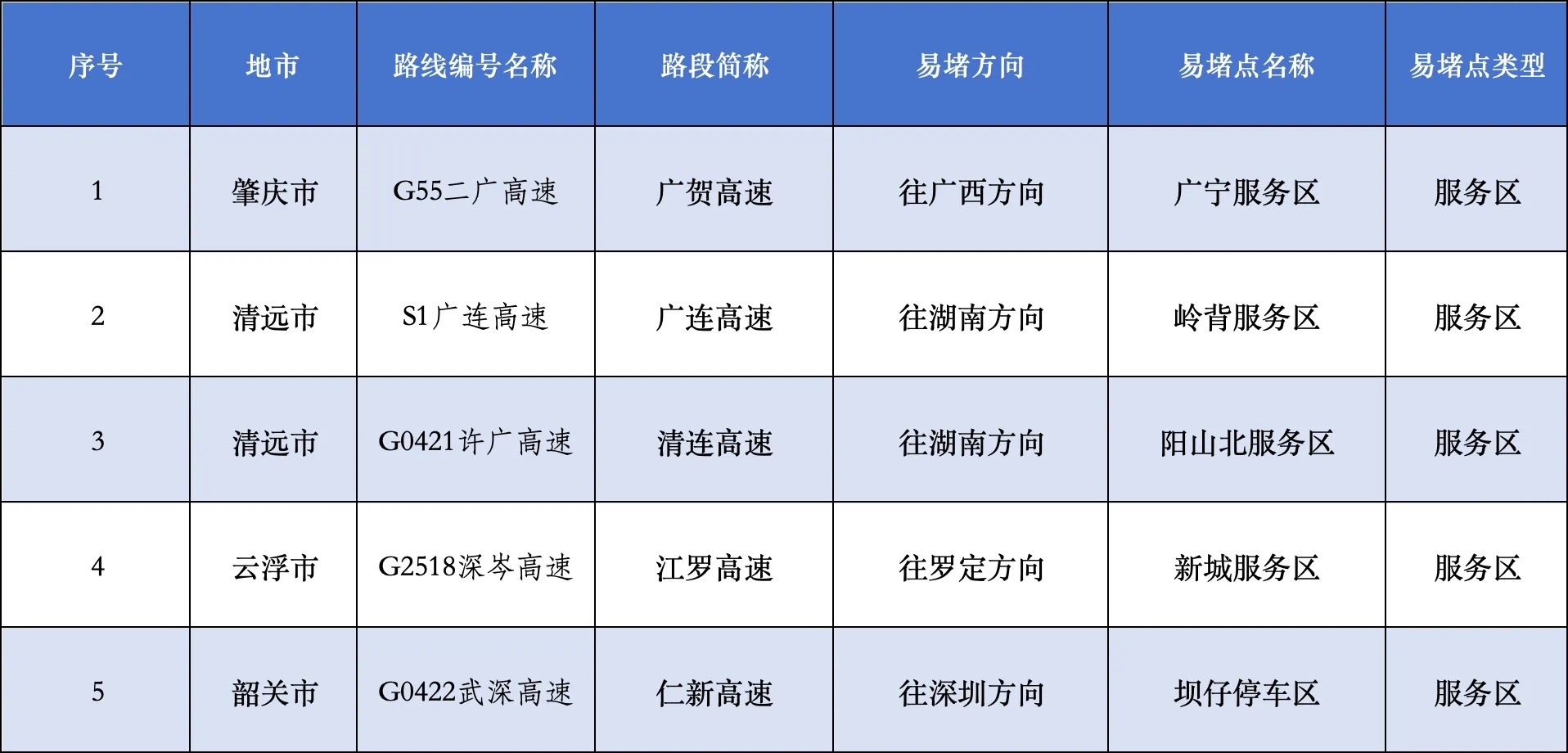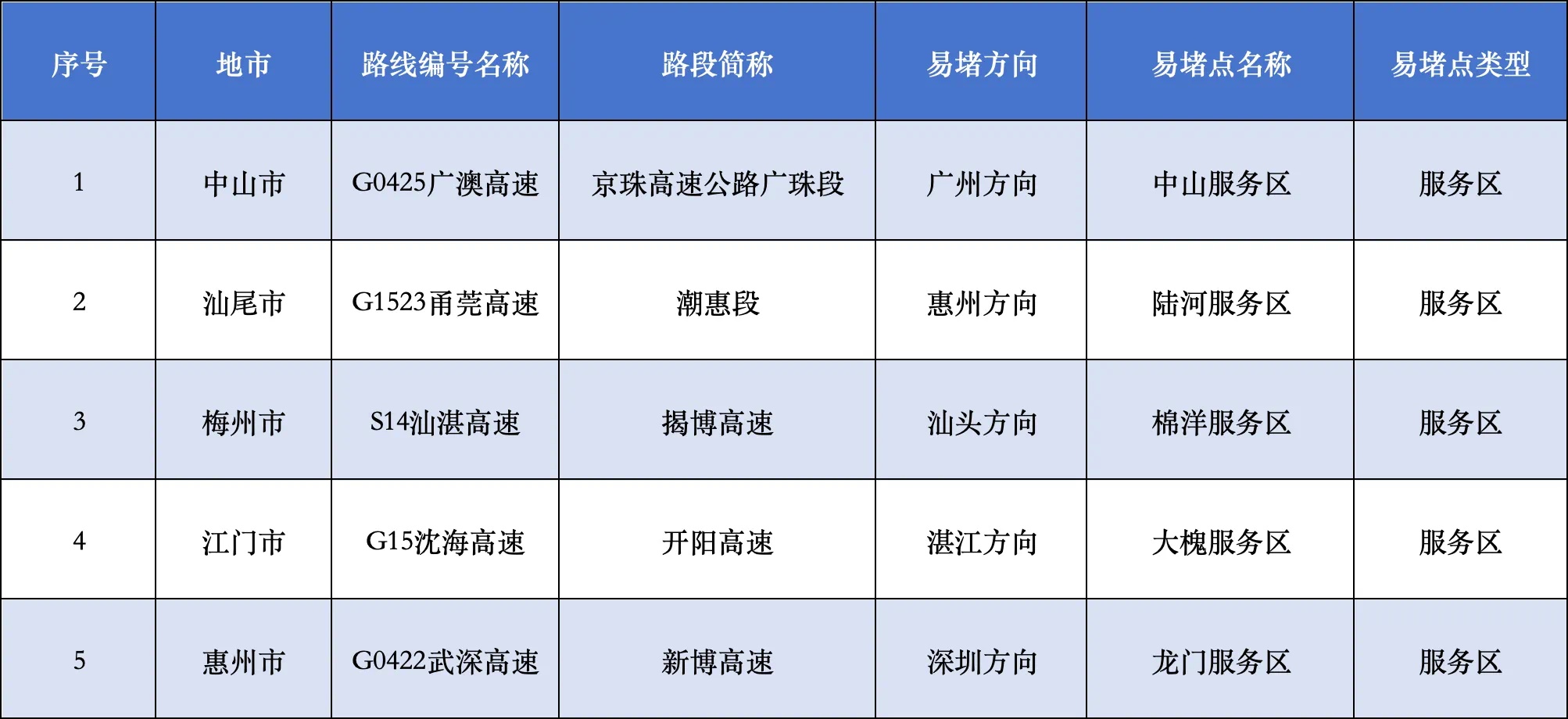 经研判,今年广东省“五一”期间较为拥堵的路段包括S6广龙高速沙田东站至沿江互通路段、S81广州环城高速沙贝立交路段等10处。车流繁忙服务区包括G55二广高速的广宁服务区、S1广连高速的岭背服务区等5处。充电繁忙的服务区则包括G15沈海高速的大槐服务区、G0422武深高速的龙门服务区等5处。