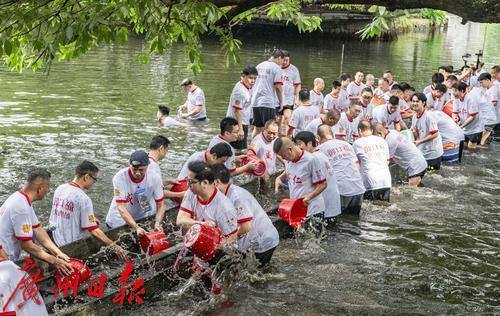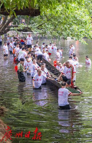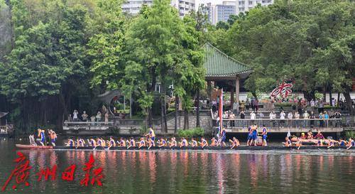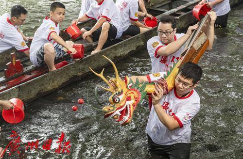 龙船出水后村民们在荔湾湖中进行试水试扒。5月31日端午节当天,这里将迎来一年一度的“五月五·龙船鼓”活动。