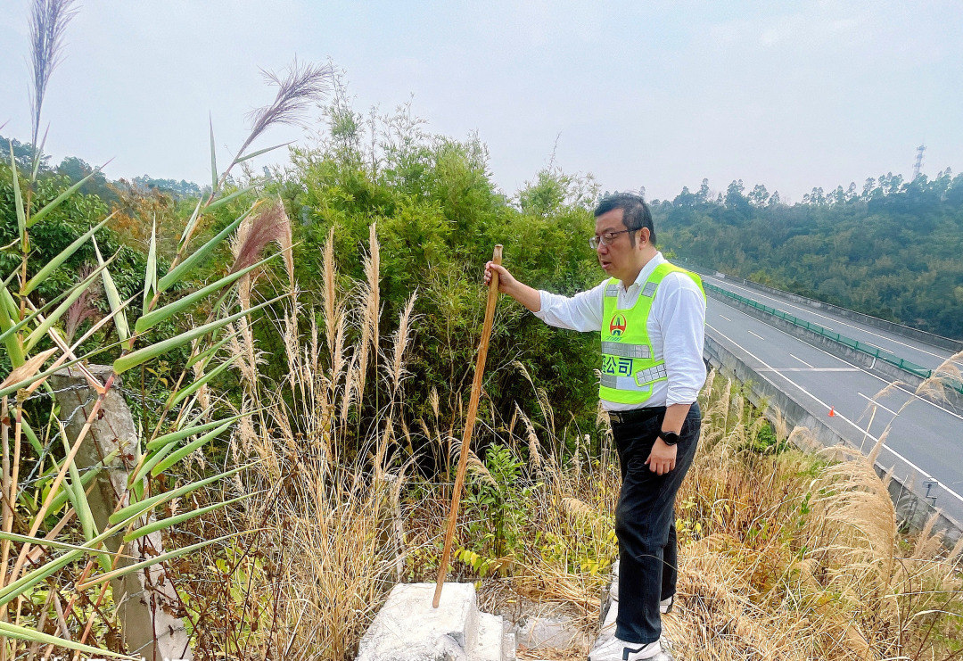 包茂高速(粤境段)不少路段地处山区,信宜段高边坡比例非常高,那六级高边坡平台的水沟横截面窄得让人畏惧。幸好手中紧攥住那根用树枝削制而成的“量天尺”,茂湛、包茂高速副总经理熊英方觉脚下多了三分定数。