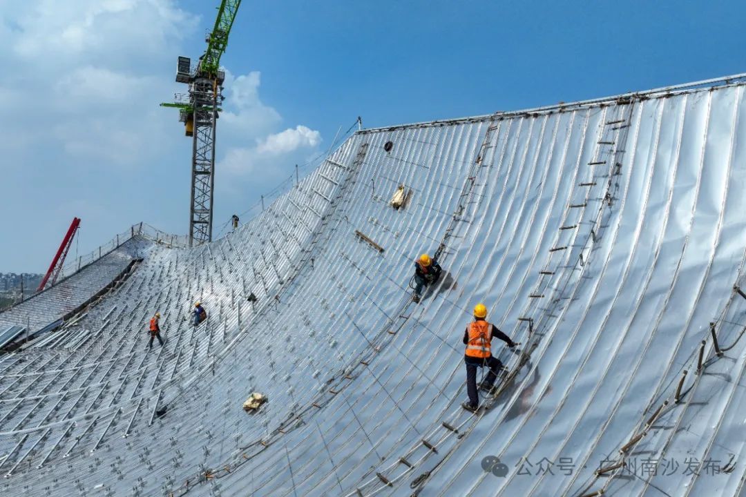 “五一”假期,八百余名建设者坚守岗位,变“假期”为“工期”,推动项目建设跑出“加速度”。据悉,项目正开展“百日攻坚”劳动竞赛,建设者们两班轮流,每日平均完成约600平方米不锈钢屋面层安装,正全力冲刺年内竣工目标。