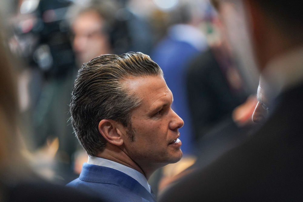 2月13日,在比利时布鲁塞尔,美国国防部长赫格塞思在会议现场。新华社记者彭子洋摄