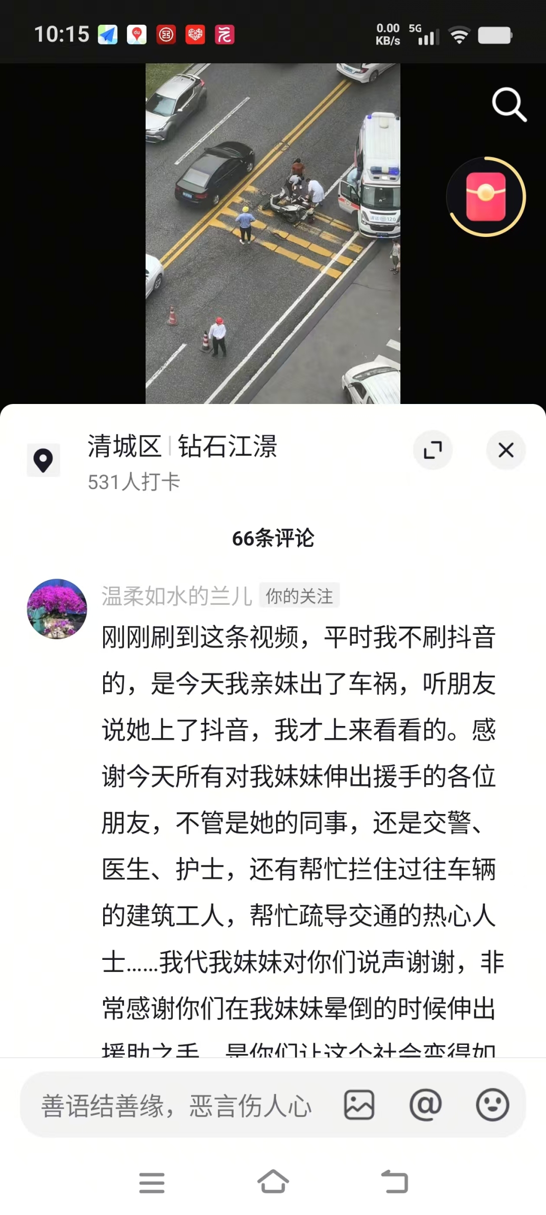 5月5日,在清远的沿江路发生了一起令人揪心又暖心的事件。一名骑摩托车的女子摔倒在马路中间当场陷入昏迷状态。在这危急时刻,一名黑衣长发,戴着安全帽的女子出现了,她察觉到昏迷女子的危险处境,很快召唤来另外几名戴着安全盔的工人,他们的出现犹如一道光,照亮了这紧张的局面。