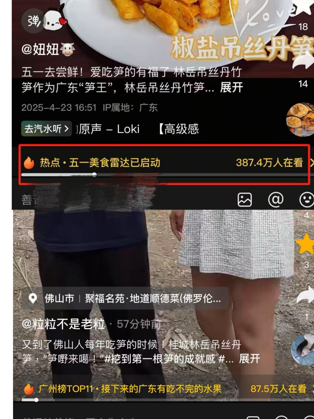 自“第二届桂城·林岳吊丝丹竹笋美食文化节”启动之后,林岳吊丝丹竹笋频频出现在各大平台推荐的佛山美食中。据不完全统计,目前各大平台关于林岳吊丝丹竹笋美食文化节的曝光量超50万,各类点赞评论互动总量超2万。其中,湾区美食博主“粒粒不是老粒”打卡林岳吊丝丹竹笋的视频,登上了抖音话题“接下来的广东有吃不完的水果”榜单。