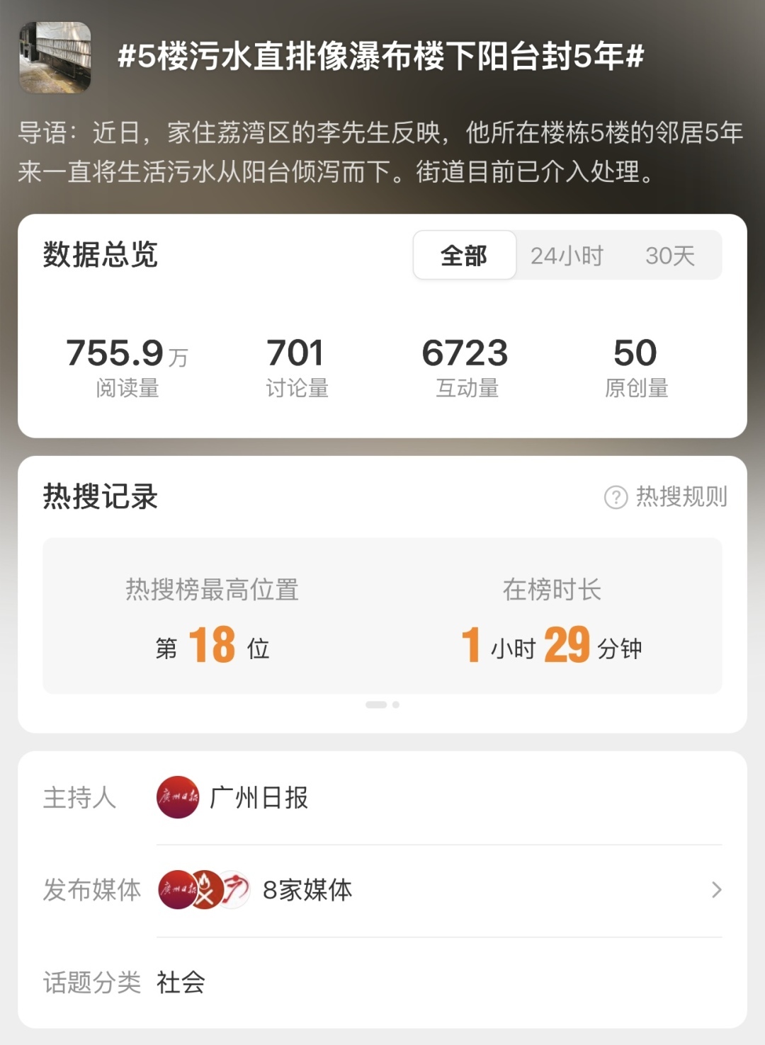 5月5日,广州日报报道了《5楼污水直排像瀑布 楼下阳台封5年》,引发热烈反响,登上全国热搜。