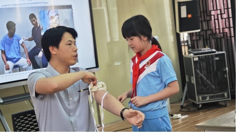 儿童意外伤害中,擦伤、割伤、鼻出血等生活损伤最为常见,学点实用的处理小妙招,说不定什么时候就能派上用场了。课程上,曾瑞峰医生向学生讲解了常见损伤的类型、成因及危害,强调掌握基础急救技能的重要性。他告诉同学们:中医急救不仅是止血包扎,更注重通过调节气血、激发自愈力促进康复。