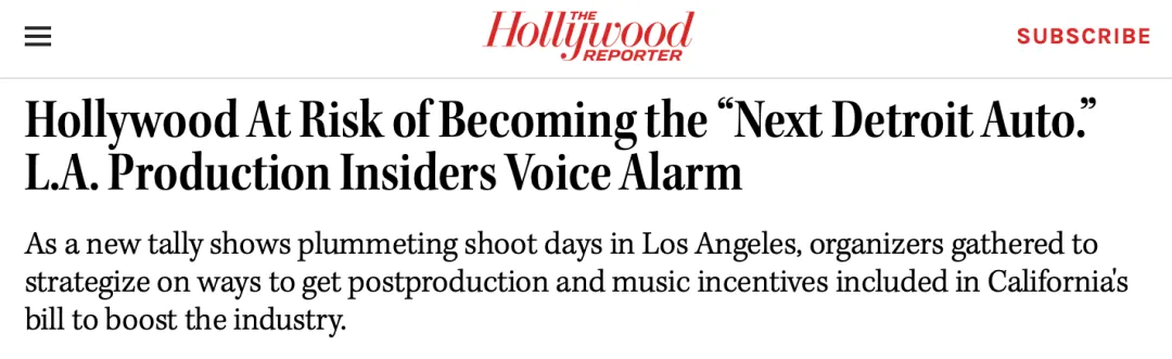 《好莱坞报道者》发表题为《好莱坞或成为下一个底特律》的文章,指出好莱坞最后可能只剩一具空壳。