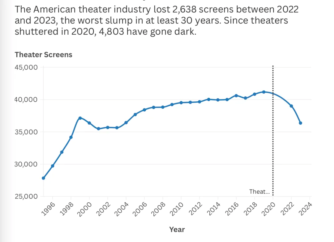 2022年至2023年间,美国影院损失了2638块银幕,这个趋势还在延续。图源:玉渊谭天