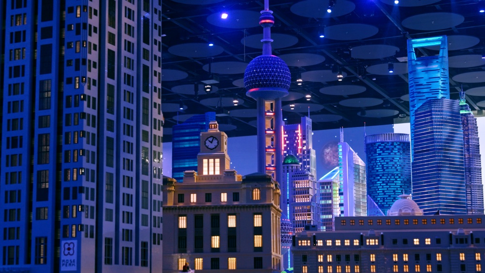 图为上海乐高乐园“迷你天地”内在夜景模式下的上海地标模型。(上海乐高乐园供图)