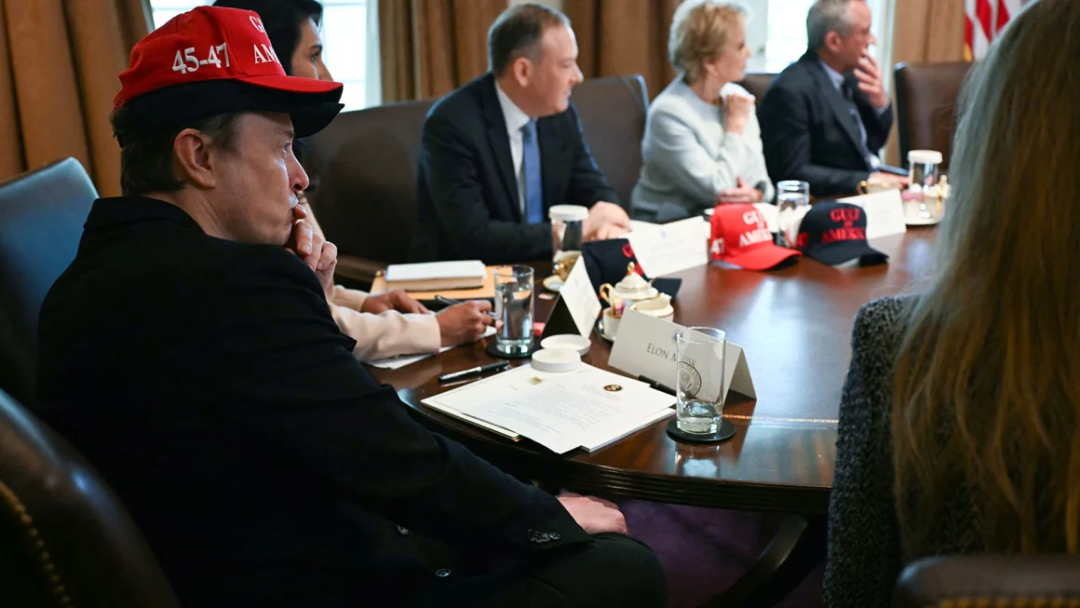 2025年4月30日,华盛顿特区白宫内阁会议室,内阁成员举行会议中马斯克戴着两顶帽子