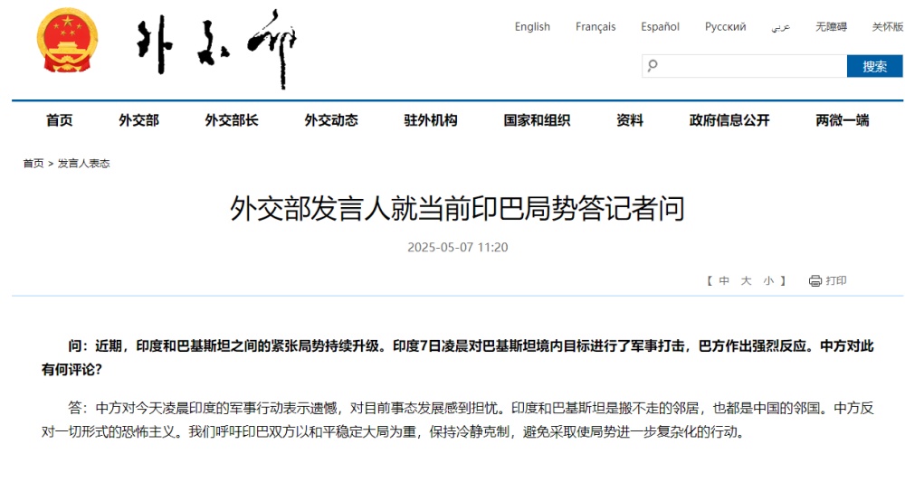 问:近期,印度和巴基斯坦之间的紧张局势持续升级。印度7日凌晨对巴基斯坦境内目标进行了军事打击,巴方作出强烈反应。中方对此有何评论?