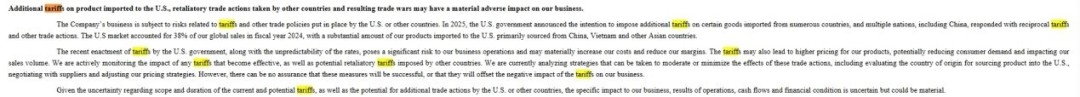 在5月2日提交给美国证券交易委员会(SEC)的文件中,斯凯奇特别警告全球贸易政策变化正对其业务构成重大风险。斯凯奇称,2024财年,美国市场贡献了公司38%的全球销售额,但美国政府近期对中国、越南等主要采购地加征的关税,可能导致产品成本显著上升、利润率下降。