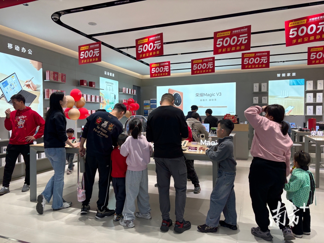 荣耀专卖店围满了前来购买电子产品的顾客。