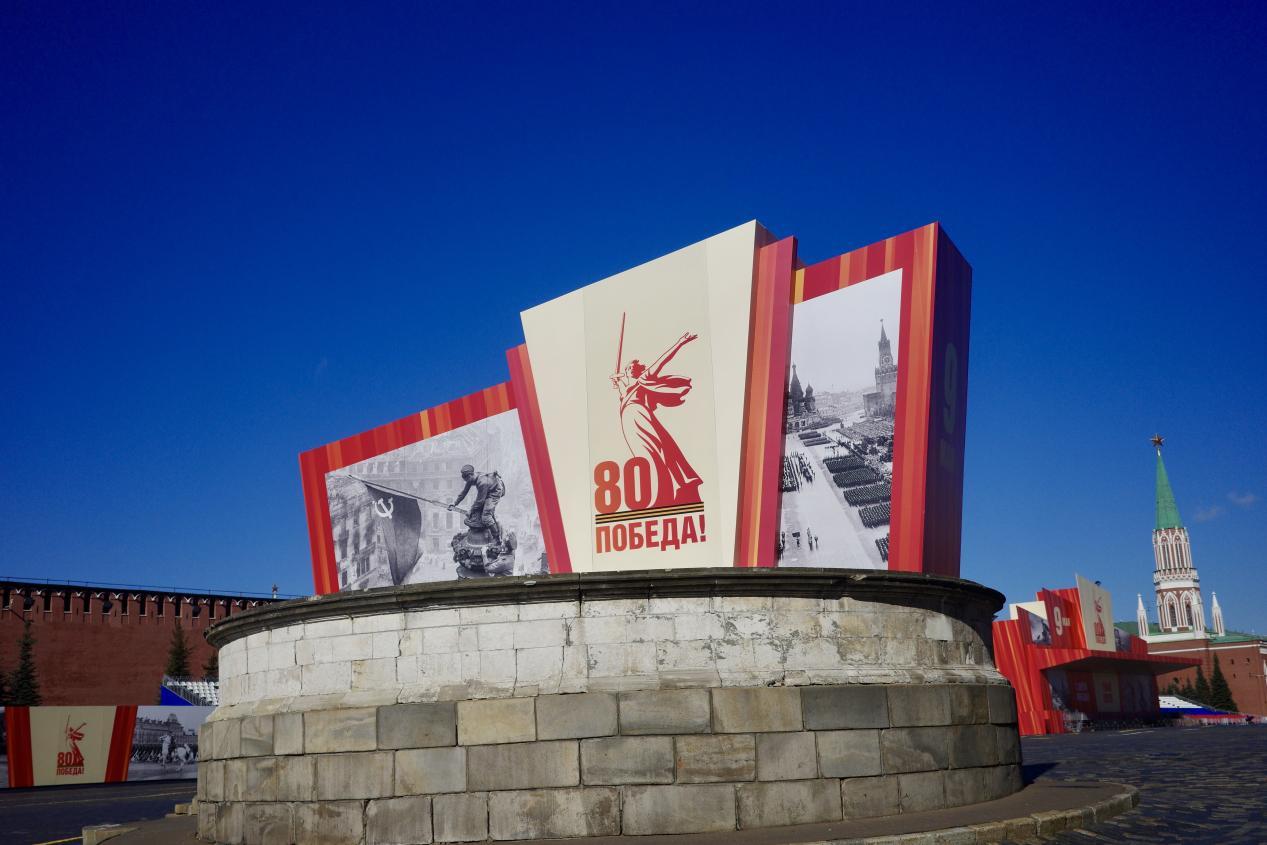 当地时间5月6日,位于莫斯科红场的圣瓦西里教堂前,已经布置好了纪念苏联伟大卫国战争胜利80周年庆典的展板。 刘少华、李建广 摄