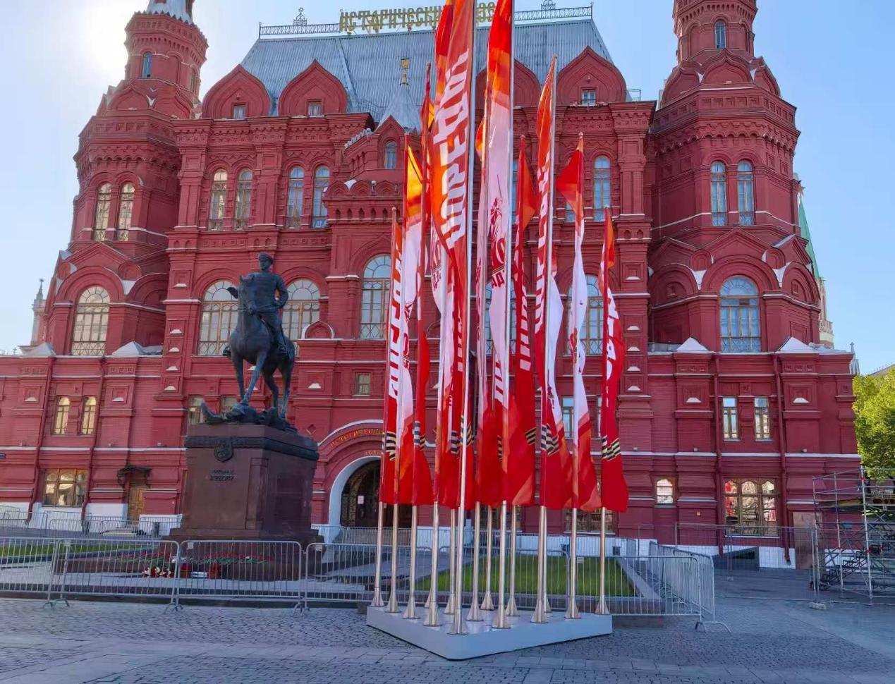 当地时间5月6日,俄罗斯国家历史博物馆前摆放纪念苏联伟大卫国战争胜利80周年庆典旗帜。 邝西曦 摄