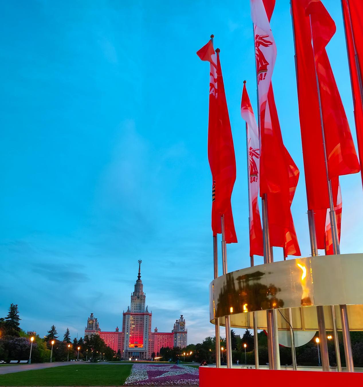 当地时间5月6日,莫斯科麻雀山,纪念苏联伟大卫国战争胜利80周年庆典的旗帜飘扬,与莫斯科国立大学主楼的灯火遥相辉映。 邝西曦 摄