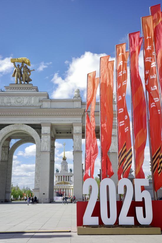 当地时间5月6日,莫斯科威登汉(国民经济成就展览馆)大门前一侧,布置好了2025标志和纪念旗帜。刘少华 摄