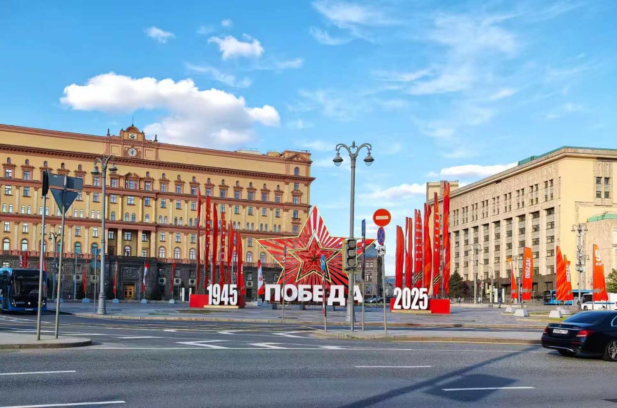 当地时间5月6日,莫斯科卢比扬卡广场布置纪念苏联伟大卫国战争胜利80周年的标语。邝西曦 摄