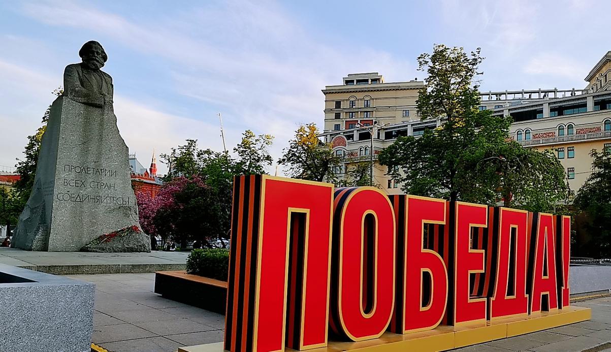 当地时间5月6日,莫斯科大剧院对面,马克思雕塑前的“胜利”字样。邝西曦 摄