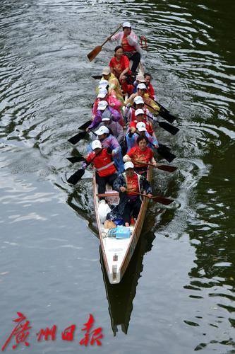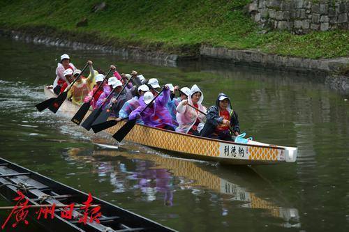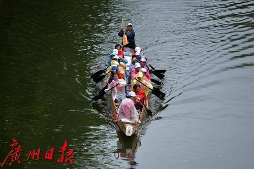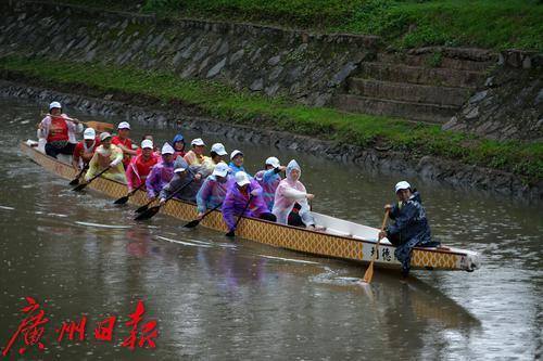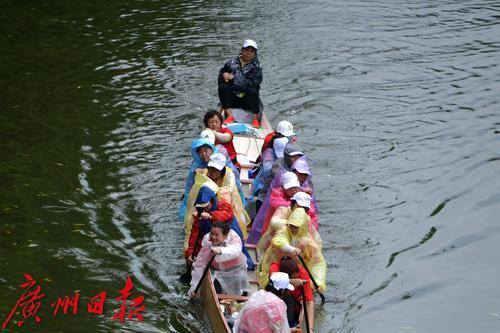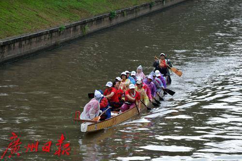 5月6日,傍晚时分广州多区迎来雷雨,但天河区珠村的女子龙舟队依然冒雨在深涌开展龙舟训练活动,她们穿着雨衣,迎着风雨卖力地划动着龙舟桨。