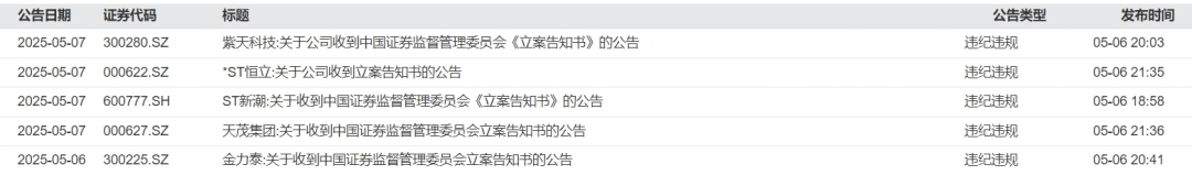 5月6日晚,ST新潮、紫天科技、金力泰、*ST恒立和天茂集团先后发布公告称,于当日收到中国证监会下发的《立案告知书》。因未按规定期限披露定期报告,根据《中华人民共和国证券法》《中华人民共和国行政处罚法》等法律法规,证监会决定对上述五家公司立案。