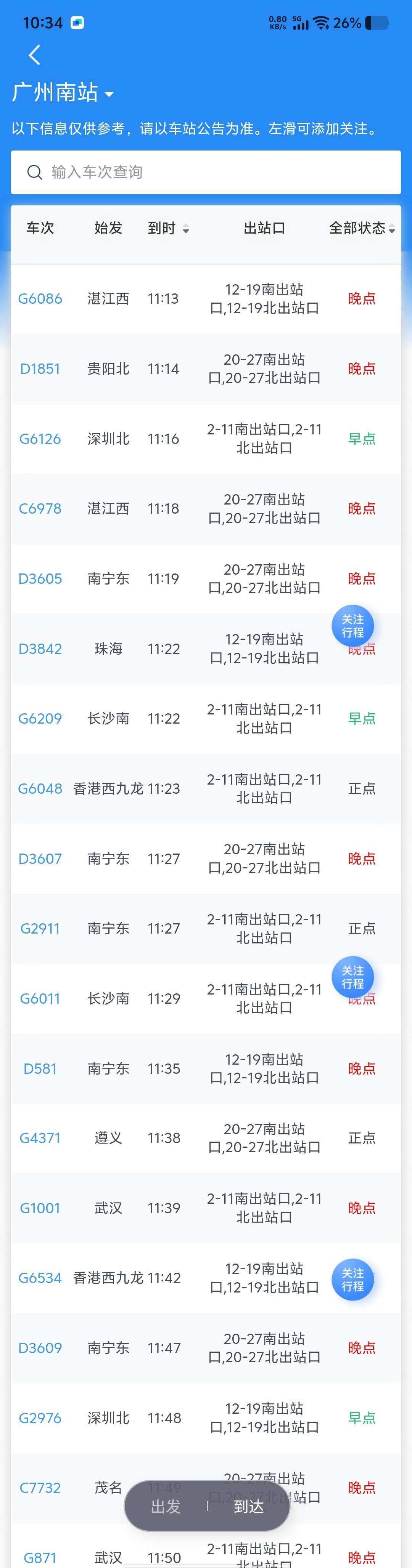 记者今日10时许查询12306发现,从11时到13时,有大概30趟到达广州南站的列车晚点,下午也有多趟列车显示晚点。