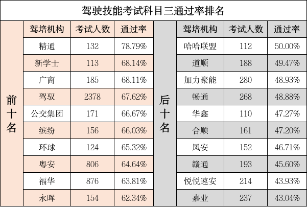 考试通过率方面,2025年3月,广州市场地驾驶技能考试(科目二)通过率最高的驾培机构的通过率为84.62%,通过率最低的驾培机构的通过率为43.42%;广州道路驾驶技能考试通过率(科目三)通过率最高的驾培机构的通过率为78.79%,通过率最低的驾培机构的通过率为43.04%(前后十名,考试人数小于100人的驾培机构不纳入统计)。