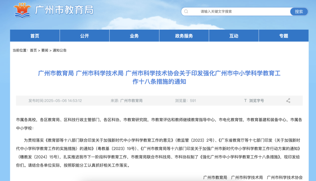 5月6日,广州市教育局官网发布《广州市教育局 广州市科学技术局 广州市科学技术协会关于印发强化广州市中小学科学教育工作十八条措施的通知》。通知显示,为贯彻落实相关文件,扎实推进广州市下一阶段科学教育工作,广州市教育局联合市科技局、市科协拟制了《强化广州市中小学科学教育工作十八条措施》(以下简称《措施》)。