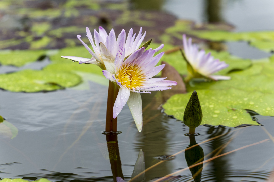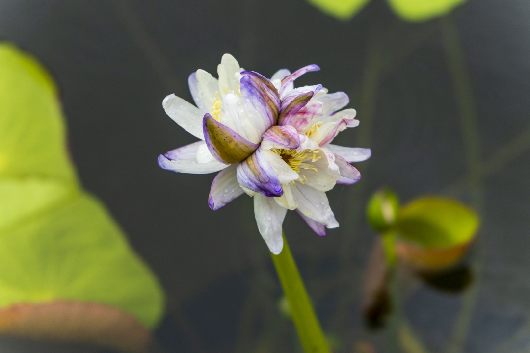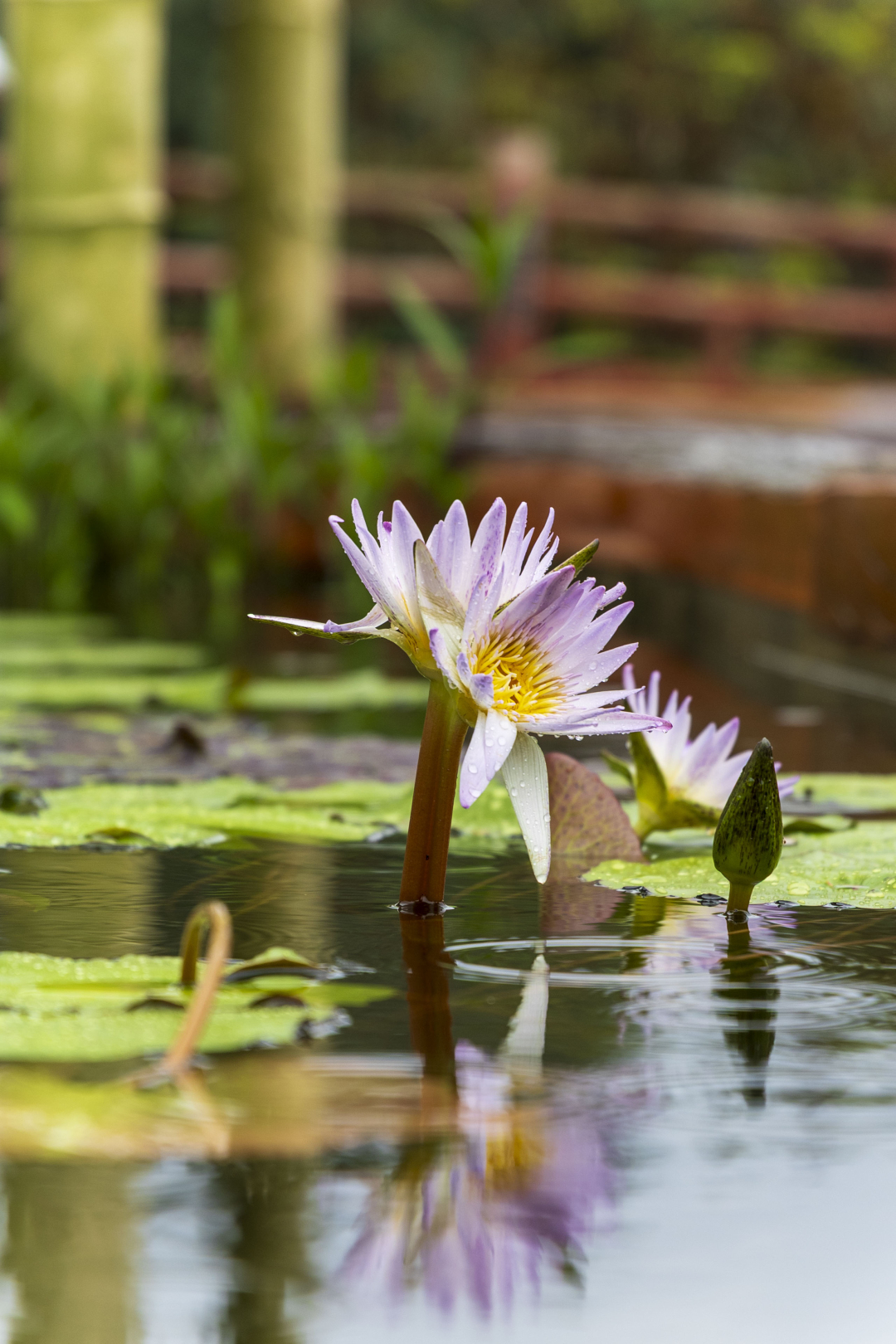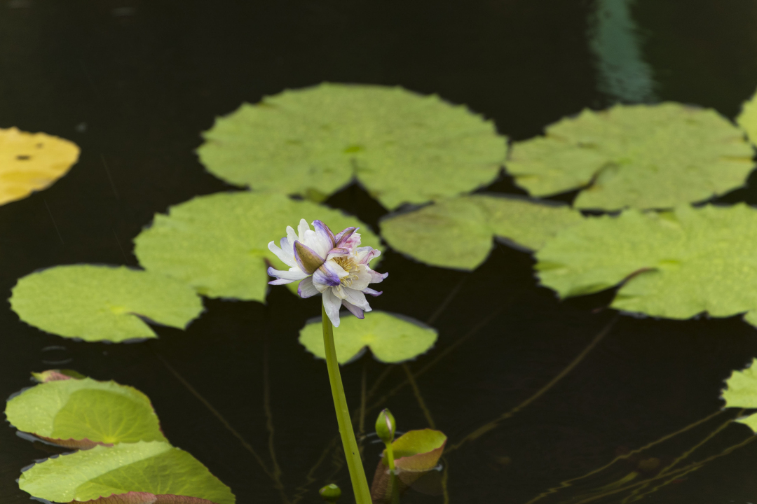 该睡莲品种花朵硕大,花径可达20-30厘米,堪称睡莲中的巨人。这株尚未命名的三蒂睡莲今年迎来初放,其花朵目前相对娇小,可观察到三个花蒂共生于同一花茎,形成错落绽放的立体花簇。该品种花朵首日呈现淡蓝色,次日渐变为浅紫色,第三日定格为粉红色,形成“三日三色”的观赏特性。
