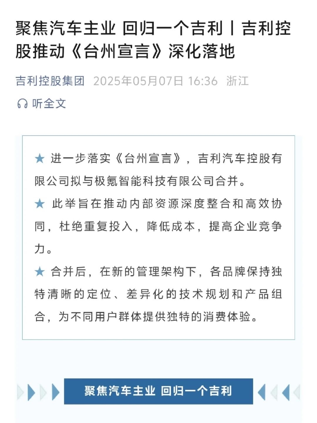 5月7日,吉利汽车发布公告宣布,为推动内部资源深度整合和高效协同,杜绝重复投入,降低成本,吉利汽车计划收购极氪已发行全部股份。
