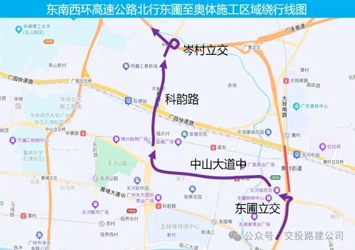 粤A号牌小型客车西行绕行路线①:原东南西环高速公路北行的车流,提前从东圃立交出→中山大道中(西行)→科韵路(北行)→岑村立交进入东南西环高速公路继续北行。